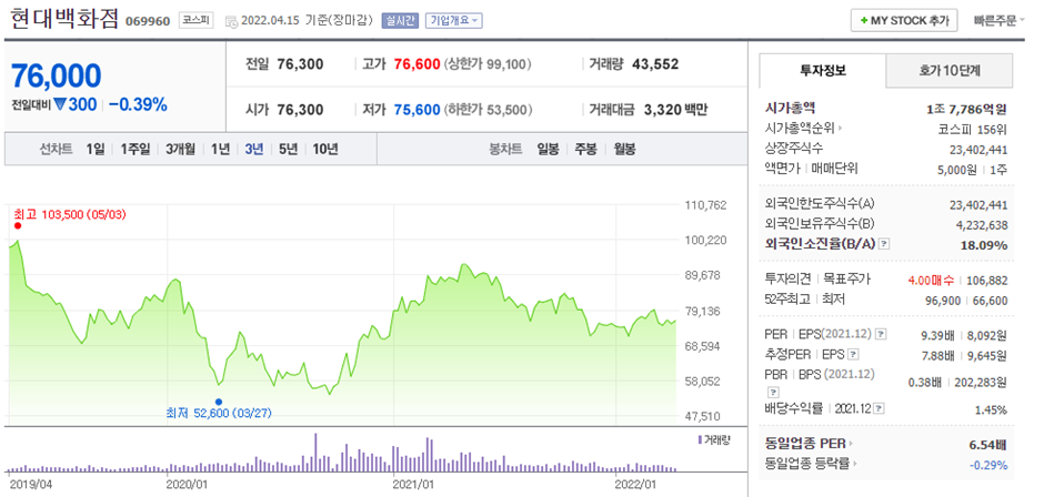 국내 3대 백화점중 하나인 현대백화점은 리오프닝 주의 대표적인 백화점 수혜주가 될 것으로 보인다.