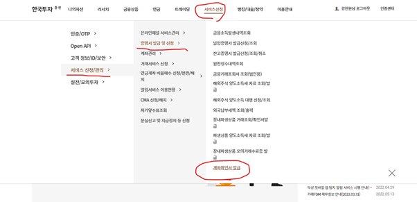한국투자증권 계좌확인서발급 메뉴