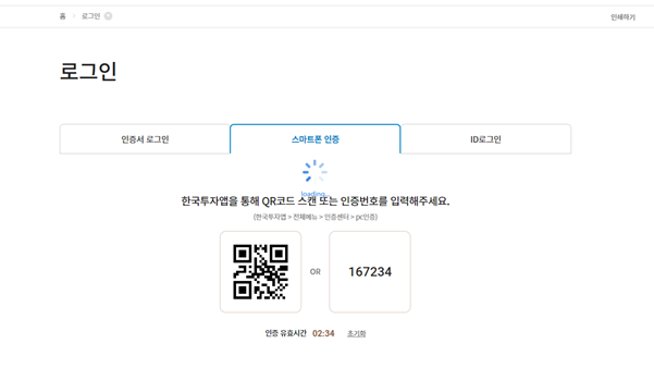 휴대폰에서 한국투자증권 어플을 열고 메뉴 → 인증센터 → PC인증 을 선택하면 QR코드를 스캔할 수 있다. 컴퓨터의 QR코드를 스캔하여 로그인 하자