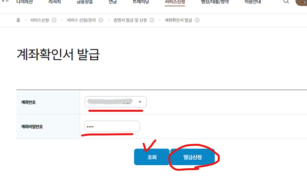 계좌번호와 계좌비밀번호(4자리?)를 누르고 조회를 누르면, 비밀번호가 맞으면 발급신청 버튼이 생긴다.