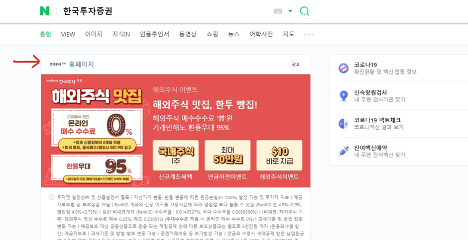 네이버에서 한국투자증권을 검색해서 들어간다. 링크가 조그만해서 잘 눈에 띄지 않는다.