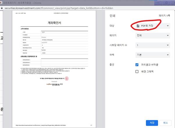 한국투자증권 계좌확인서 인쇄