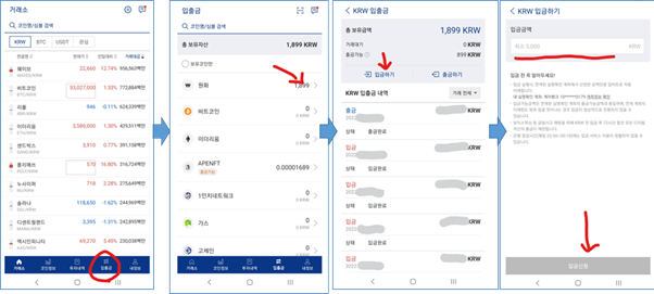 KRW입출금 화면에서 입금하기를 누르면 카카오페이 인증을 통해서 내 케이뱅크의 돈이 업비트로 이동된다.