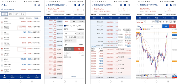 KRW 마켓은 원화로 매매를 하는 마켓이고, BTC마켓은 비트코인으로 매매를 하는 마켓이다. USDT마켓은 테더(미국 달러와 가격 연동)로 매매를 하는 마켓이다.